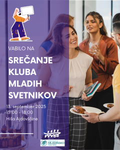 Vabimo vas na srečanje Kluba mladih svetnic in svetnikov Slovenije, ki bo potekalo 13. septembra 2025, med 15.00 in 18.00, v Hiši mladih Ajdovščina. Formalnemu delu sledi neformalni del s pogostitvijo. Namen srečanja je medsebojno spoznavanje, predstavitev kluba ter izmenjava dobrih praks lokalne mladinske politike. Hkrati je cilj srečanja tudi promoviranje struktur, ki omogočajo […]