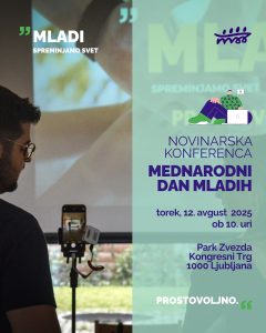 Napoved Vabimo vas na tradicionalno novinarsko konferenco ob Mednarodnem dnevu mladih, ki bo potekala v torek, 12. avgusta 2025, ob 10. uri, v Parku Zvezda v Ljubljani. Na konferenci bomo: – spregovorili o letošnji tematiki Mednarodnega dneva mladih, – predstavili rezultate kampanje “Mladi spreminjamo svet – prostovoljno!” oz. “#MSSprostovoljno”, – uradno predstavili javnosti mnenjski dokument […]